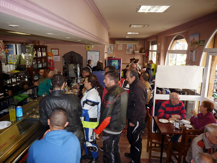 El día amaneció fresco. En la costa no había llovido, pero ya a pocos kms me encontré el asfalto totalmente húmedo de la lluvia de la noche. Hasta que llegado al Puerto de Las Pedrizas, una densa niebla tenía invadida la autovía. Pero con tranquilidad, los kms fueron pasando y a las 9:35 ya me encontraba en el local donde íbamos a desayunar, avisando a las chicas del bar que una avalancha de aguerridos y valientes moteros se disponían a arribar en el local con un apetito por el típico “mollete antequerano”. Así que junto con ellas, me puse a ayudarles a preparar en la puerta una docena de mesas, para poder sentarnos todos juntos.