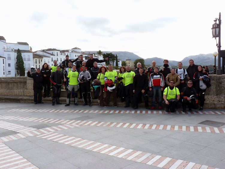 Una vez ya entrando en Ronda, puse rumbo hacia el Tajo, lugar donde parar para fotografiar el encuentro … pero no sin antes, rogarle y suplicarle a los señores de la autoridad un permiso especial y temporal (5 minutos) de aparcamiento en la misma Plaza de España de Ronda, y a escasos 10 metros del Tajo. Reagrupamiento e intento de que el personal se pusiese las camisetas de la ruta (pero se ve que hay mucho friolero) para inmortalizar el momento.
